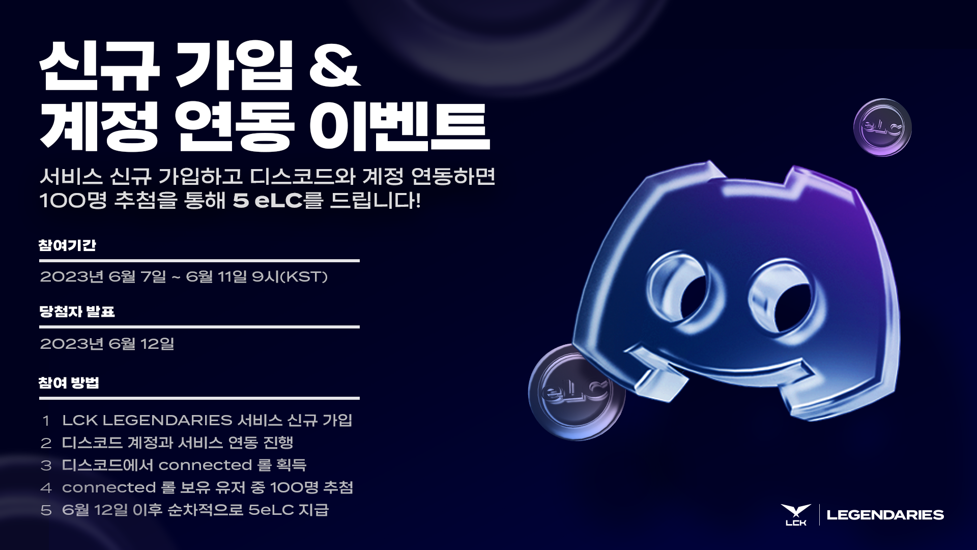 ๋์ค์ฝ๋์์ ์งํํ๋ ๋ค์ํ ์ด๋ฒคํธ๋ฅผ ํตํด eLC๋ฅผ ํ๋ํ ์ ์์ต๋๋ค. ์ฌ์ ๋ฑ๋ก ๊ธฐ๊ฐ ๋์ ์ด๋ฒคํธ๋ฅผ ํตํด FAM, Legend Coach ๋กค ๋ฑ ์ ํ๋ํ ์ ์ ๋ค์๊ฒ๋ eLC๊ฐ ๋ณด์์ผ๋ก ์ง๊ธ ๋๋๋ฐ์. ๋์ค์ฝ๋์ LCK LEGENDARIES ์๋น์ค ๊ฐ ๊ณ์ ์ฐ๋์ด ์๋ฃ๋ ์ํ์ฌ์ผ eLC๋ฅผ ํ๋ํ์ค ์ ์์ต๋๋ค. ์์ผ๋ก๋ ๋์ค์ฝ๋์์ ์งํ๋๋ ์ด๋ฒคํธ ์ค eLC๊ฐ ๋ณด์์ผ๋ก ์ง๊ธ๋๋ ๊ฒฝ์ฐ, ๊ผญ ๊ณ์ ์ฐ๋์ด ํ์๋ผ๋ ์ ์์ง ๋ง์ธ์.