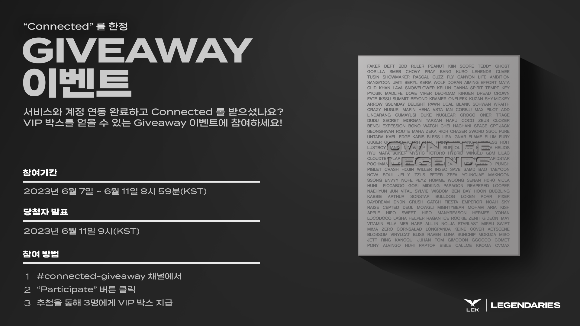 LCK LEGENDARIES ์๋น์ค์ ๋์ค์ฝ๋ ๊ณ์ ์ฐ๋ ๊ด๋ จ ์๋ด ๋๋ฆฝ๋๋ค. ๋ํ, ํ์ ๊ธฐ๊ฐ๋์ ์งํ ์ค์ธ ๊ณ์ ์ฐ๋ ์ด๋ฒคํธ 2์ข ๋ ํจ๊ป ์๊ฐ ๋๋ฆฝ๋๋ค.