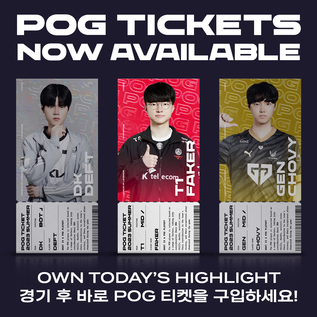 LCK ๋งค ๊ฒฝ๊ธฐ ๊ฐ ์ธํธ ์ข ๋ฃ ์ POG(Player Of the Game)๊ฐ ์ ์ ๋ฉ๋๋ค. ๊ทธ ์์ ๋ถํฐ 99๊ฐ์ ํ์ ์๋์ POG ํฐ์ผ ํ๋งค๊ฐ ์์ ๋๋๋ฐ์. 12์๊ฐ ๋ด์ ์๋์์ ๋๋ฉด ์กฐ๊ธฐ์ ํ๋งค ์ข ๋ฃ ๋ ์ ์์ต๋๋ค. ์ ํ ์๊ฐ ๋ด ๋ชจ๋ ํ๋งค๋์ง ์๋๋ผ๋ ๋ ์ด์ ํ๋งค๋ ์ฐ์ฅ๋์ง ์์ต๋๋ค. ์ฆ, ํ๋งค๋ ๊ฐ POG ํฐ์ผ ๊ฐ์ ๋งํผ๋ง ๊ฐ POG ์นด๋๊ฐ ์ถ์ ๋๊ธฐ ๋๋ฌธ์ ์ด๋ ๋งค์ฐ ํน๋ณํฉ๋๋ค.