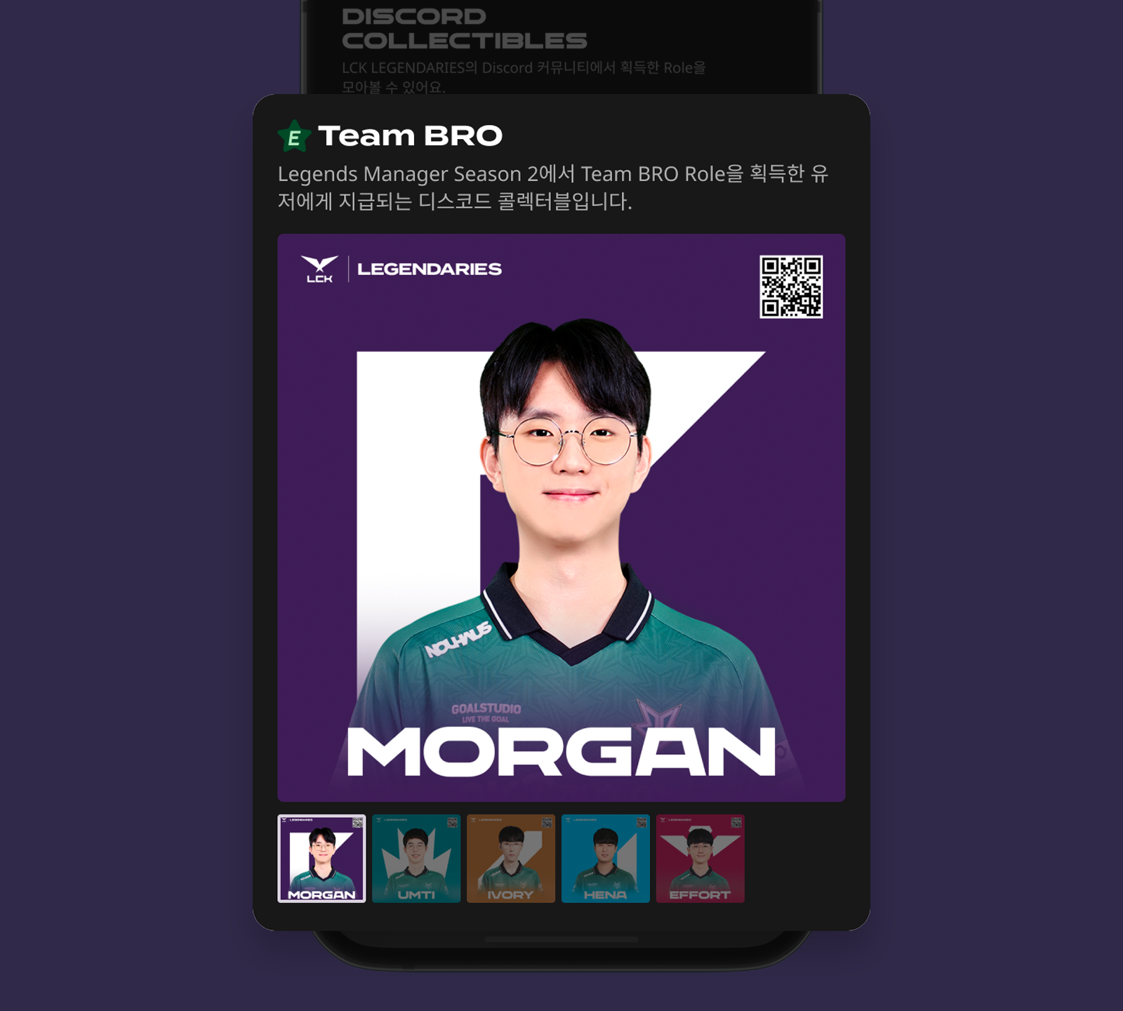 在 'Legends Manager Season 2'中,根据您所获得的 Team Role,相应战队选手的Legends Manager Season 2照片将更新到您的‘我的收藏’中。例如,如果您持有Team HLE的角色,那么无论您购买了哪个选手的照片,HLE战队所有选手的5张照片都将更新到您的‘我的收藏’中。