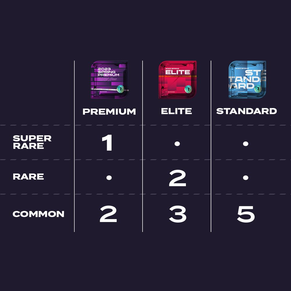 不久前,LCK LEGENDARIES推出了包含上赛季精彩瞬间的'2023春季赛季度包'系列。其中,首轮比赛的2023春季R1 - Standard, Elite, Premium三种包已率先亮相。除此之外,我们还为新晋传奇粉丝们提供了Welcome Pack, Starter Pack, PRM Pack。是否已经发现这些包的共同特点了呢?