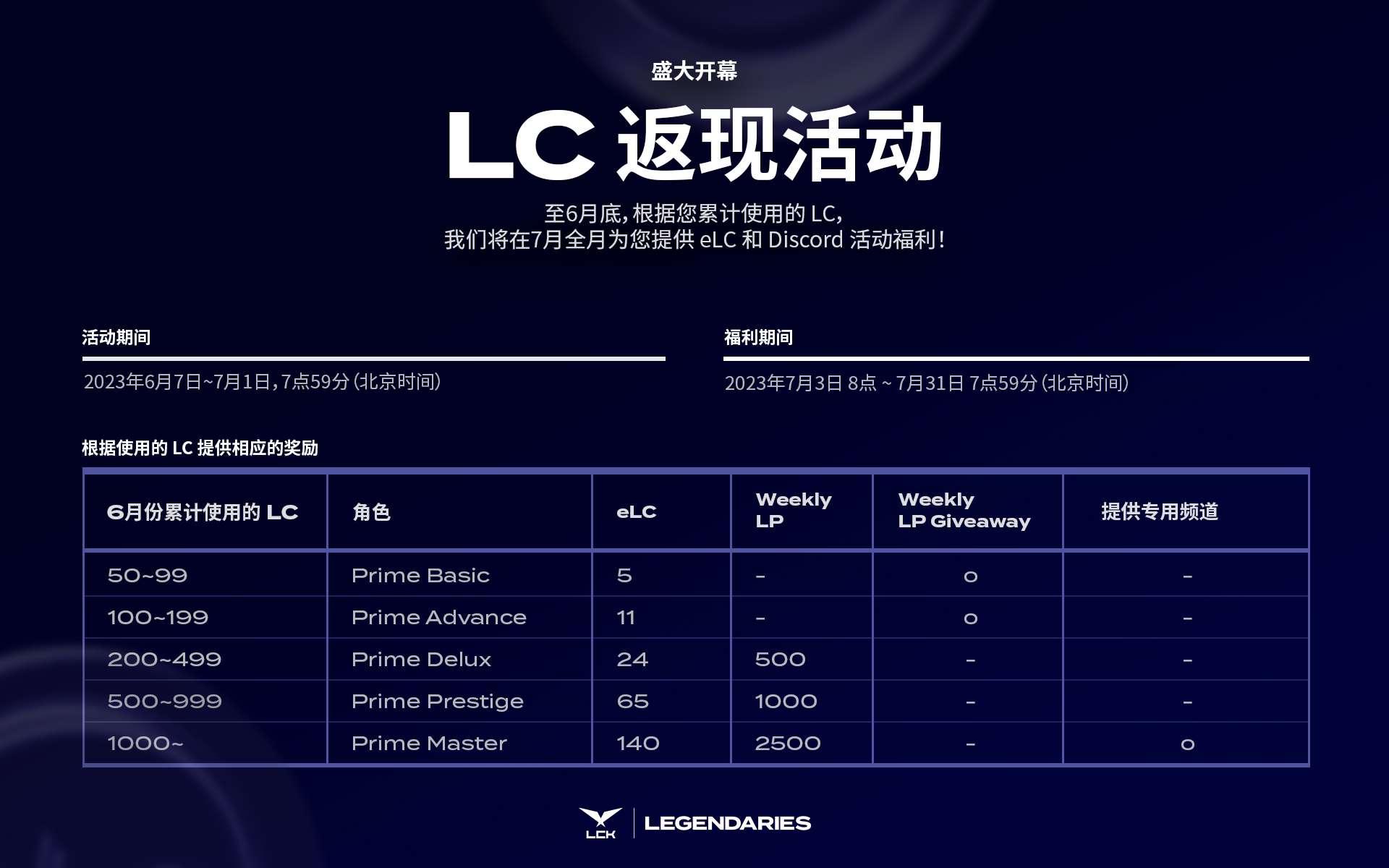 为了庆祝LCK LEGENDARIES平台的Beta开放,我们将在6月份进行一个月的LC返现活动。从6月7日开始至7月1日7点59分(北京时间)结束,根据您在此期间累计使用的LC金额,我们将在7月份提供eLC和Discord活动优惠。具体的LC使用金额和相应的奖励,请参考下面的图片内容。