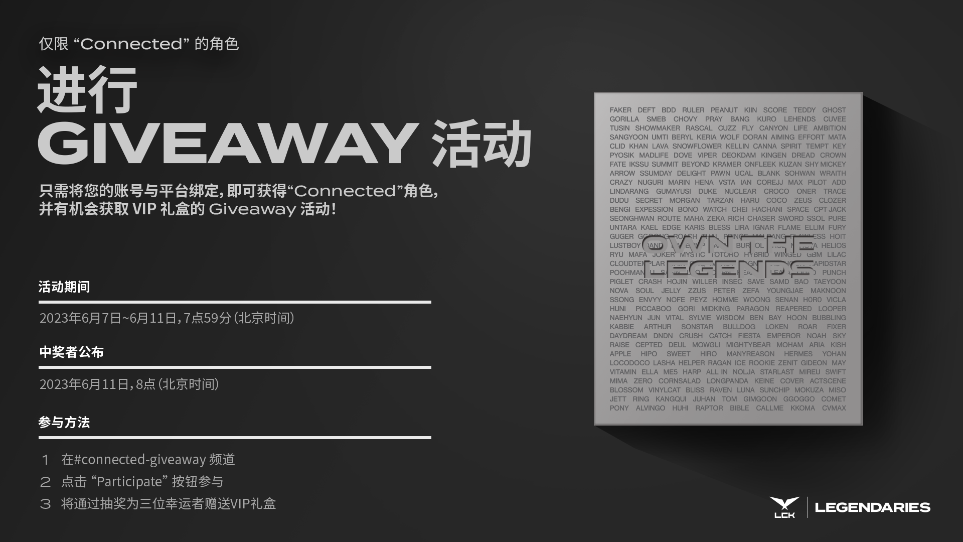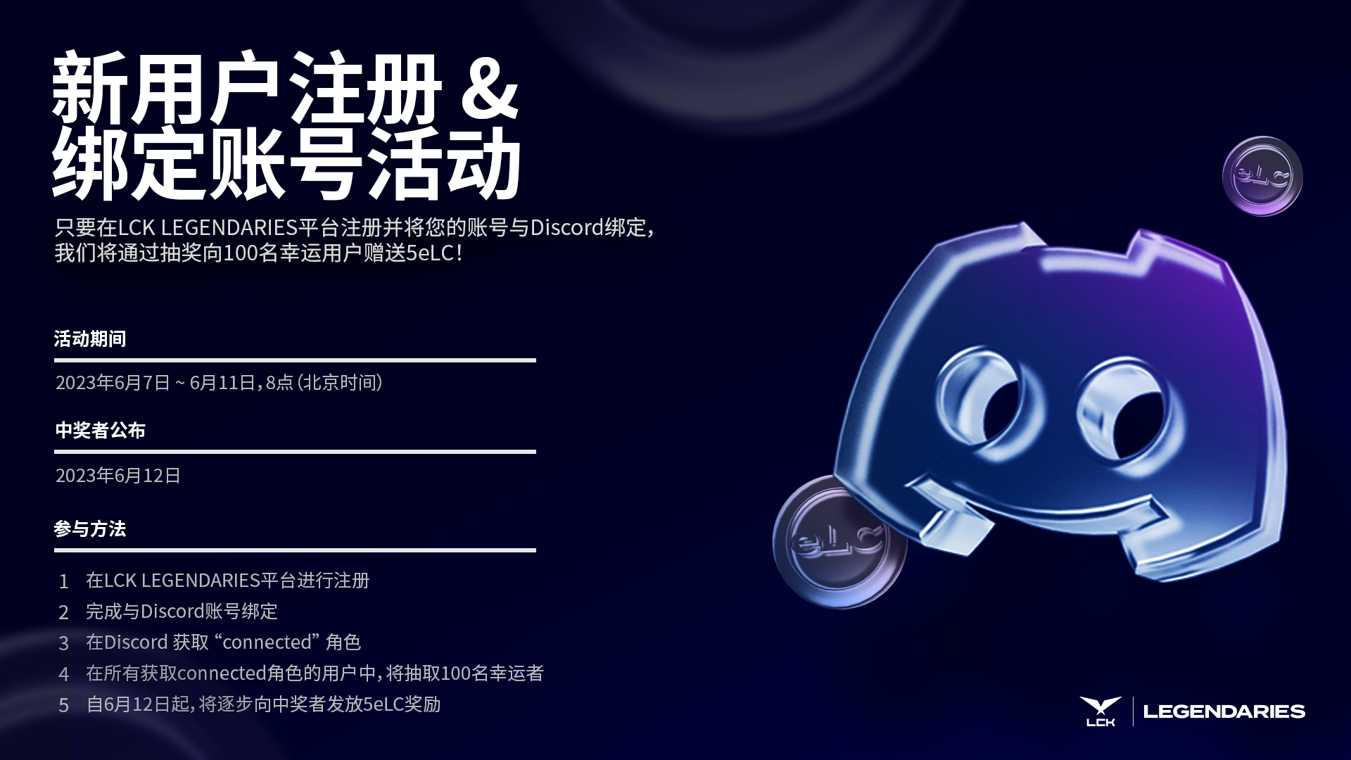 我们将为大家提供关于LCK LEGENDARIES平台与Discord账号绑定的信息。同时,也将介绍两项限时的活动。